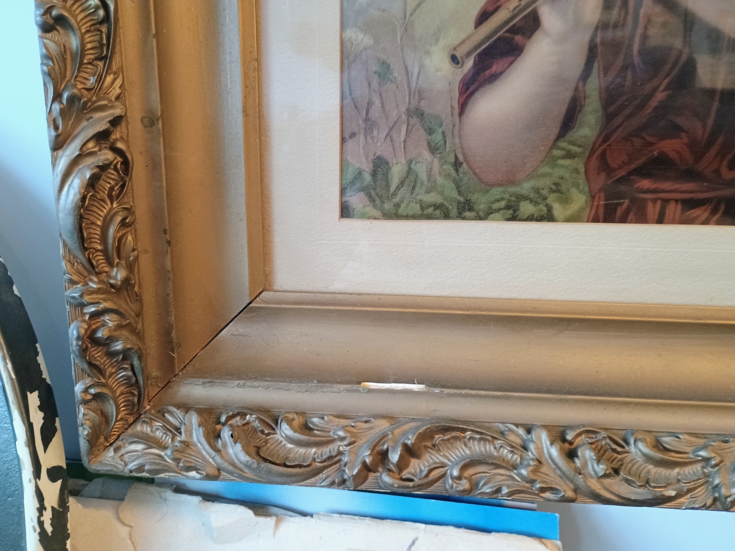 Framed in a gorgeous gold pained frame with raised a leaf detail pattern.